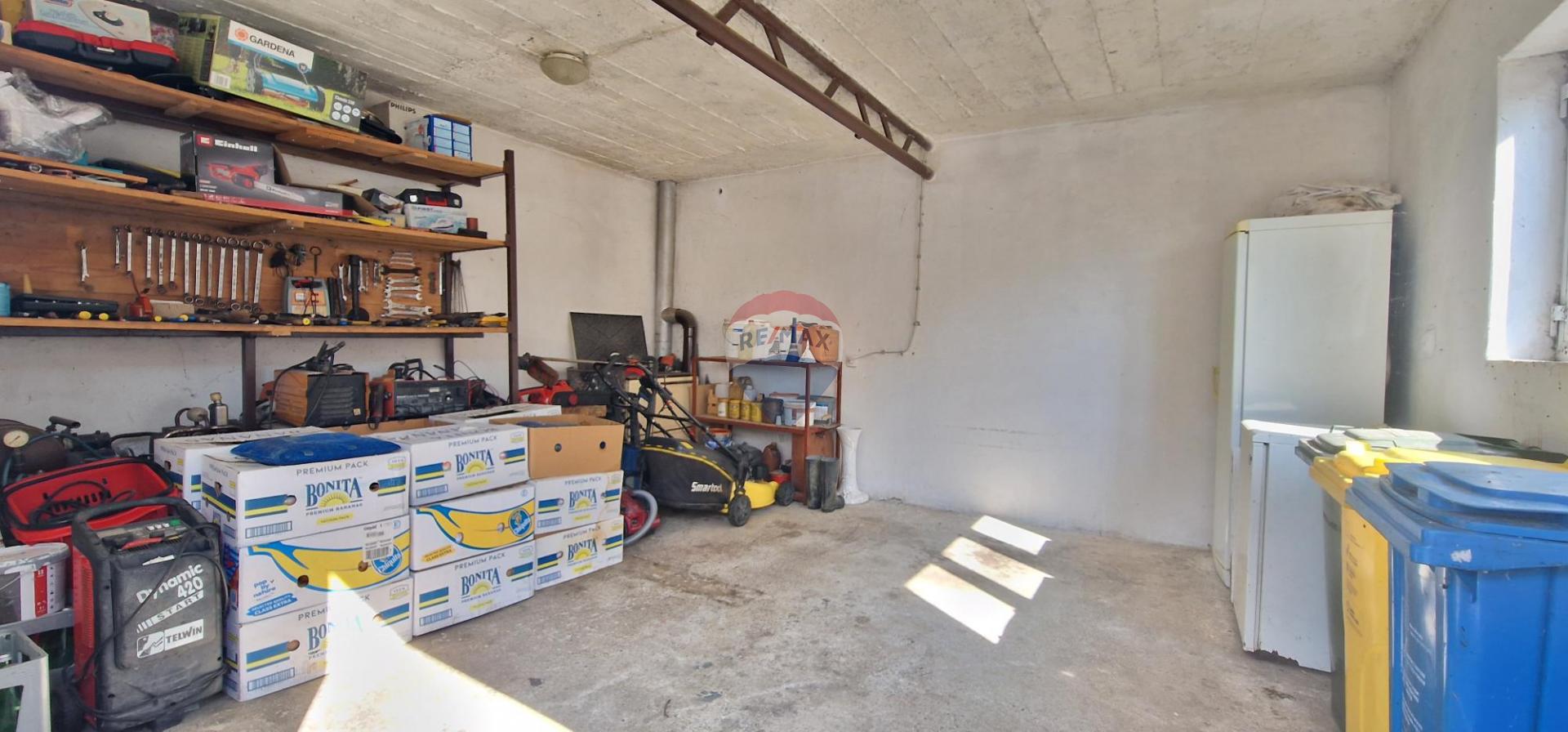 Uređena garaža od 26 m2, 2 natkrivena parkirna mjesta 34 m2, spremišta i drvara kao i gospodarski objekti prostiru se duž parcele sve do oranice od 620m2 koja se nalazi u nastavku.