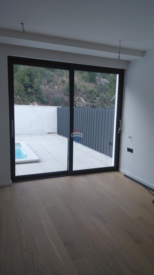 Stanu pripada okućnica površine 68 m² s vlastitim bazenom od 22 m², vrt od 44 m² oplemenjen biranom mediteranskom hortikulturom te tri parkirna mjesta u podzemnoj garaži zgrade.
